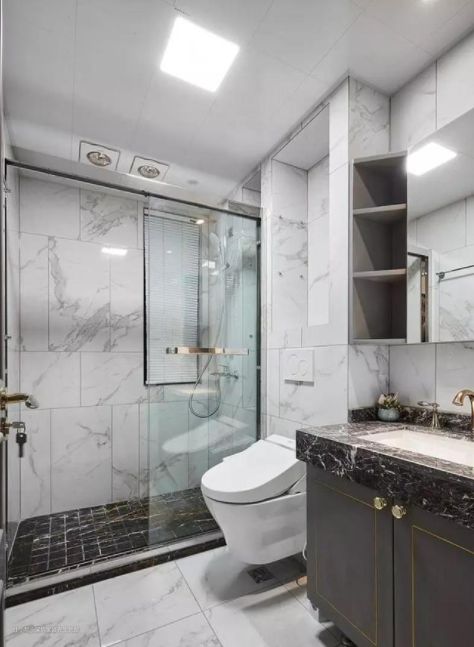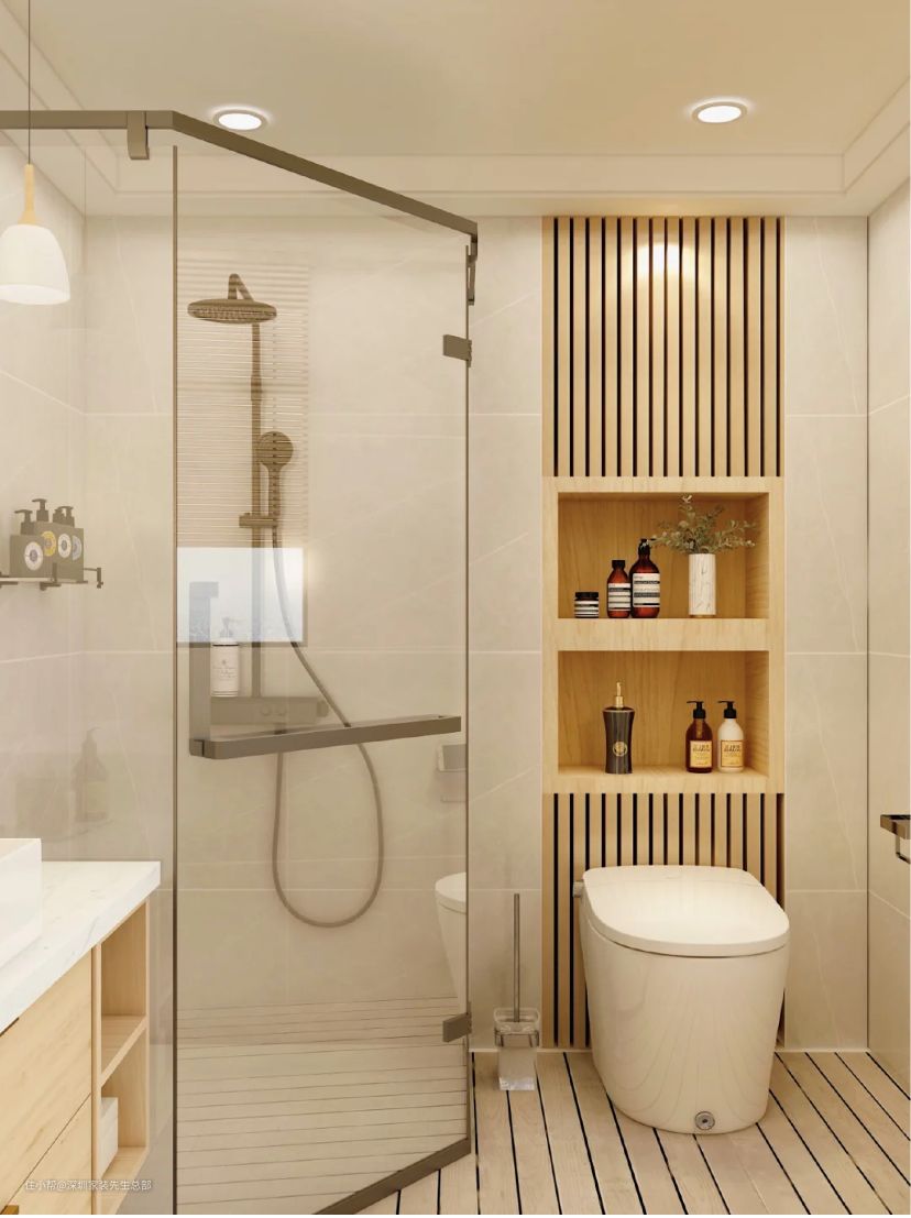 科普一点,浴室门的位置不同,设计也不同。洗手间小可直接分为淋浴、马桶、洗手台三个区域,选择合适的放置位置,不但进出方便,而且可增强空间感。