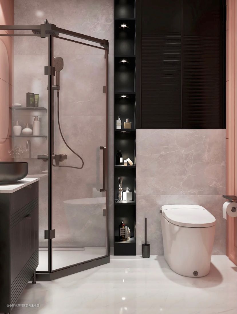 墙面和地面都是选用哑光砖配的大理石瓷砖,颜色上是粉配米灰,是少女心的暖色,另外在卫浴中加入黑色元素,让整体更大气,不拥挤。