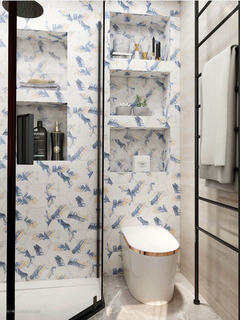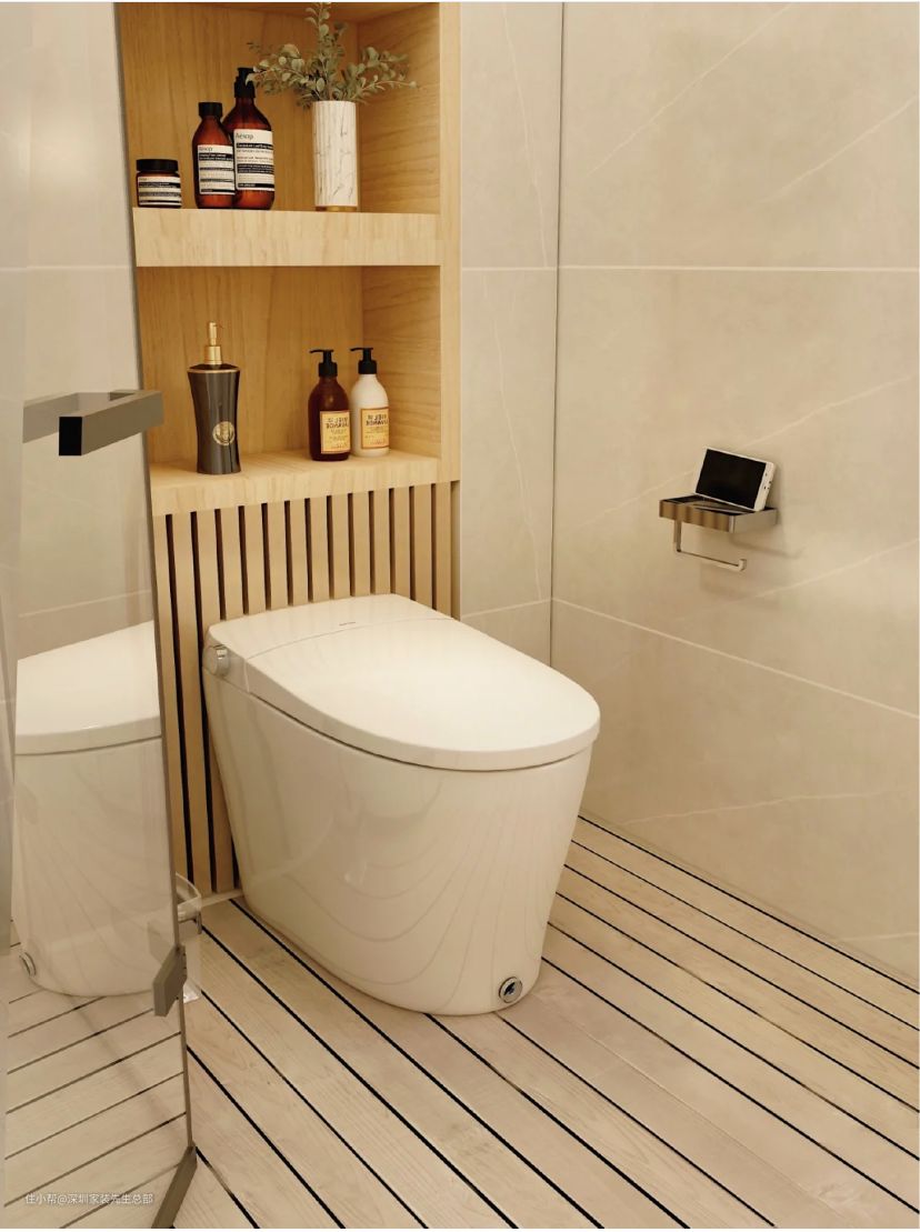 卫生间、蹲厕区增加壁龛嵌入柜内,收纳功能更强,可放置沐浴露等生活用品。