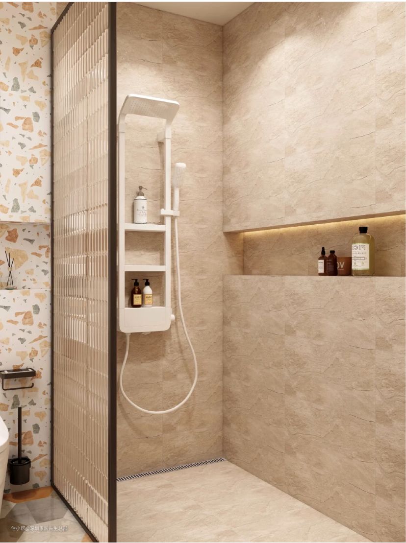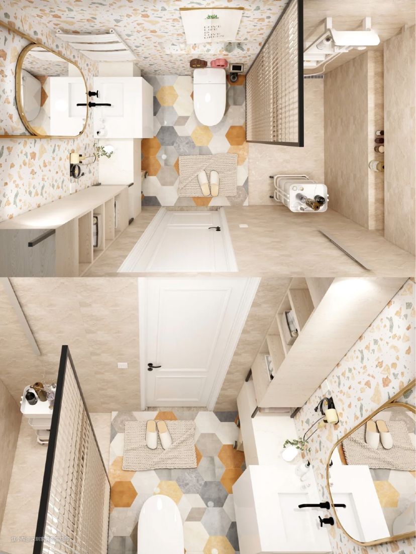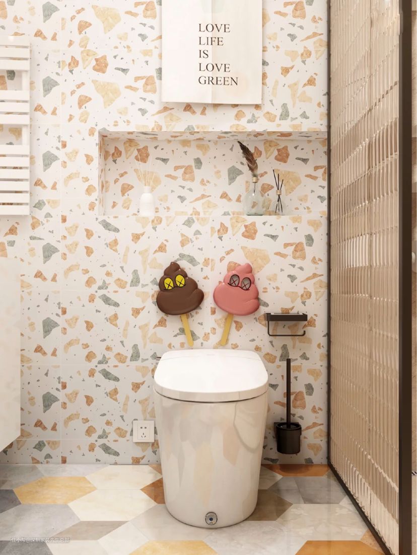 整体采用三种暖色瓷砖,岩板+彩色拼接砖+水磨石。浴室选用浅色纯色,洁净为主,视觉和谐空间显大。