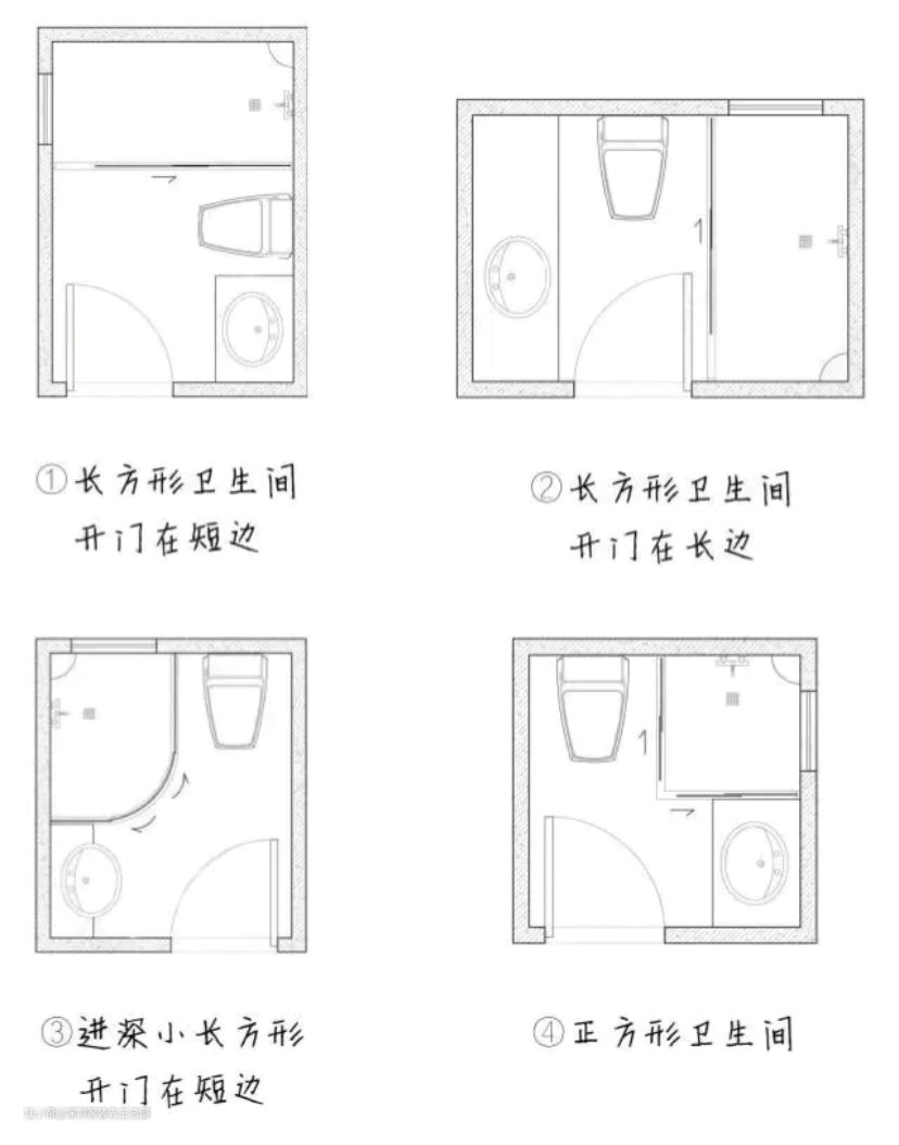 今天我们以常见的长方形卫生间户型为例,看门在不同的位置,如何设计实现干湿分离,最大限度地提高空间利用率。