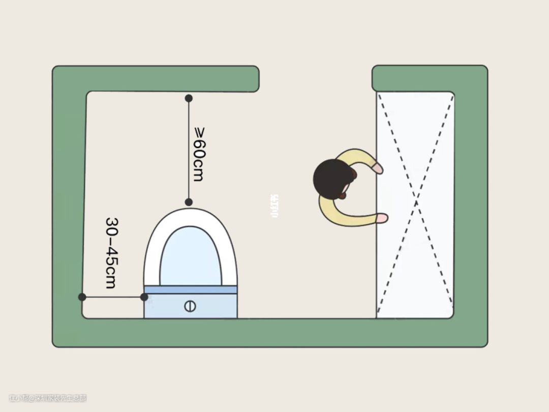 ▲卫生间两侧与墙面的距离建议为30-45厘米,前方应预留60厘米以上的空间。