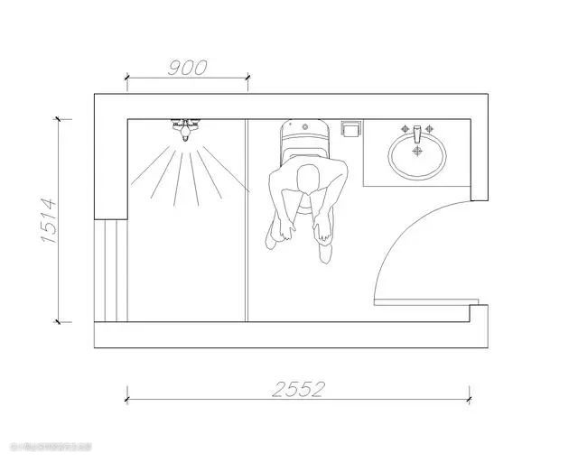 短边卫生间开门布置简单,一般从外到内分别是洗手盆、马桶、淋浴房。