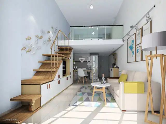 现在很多年轻业主都会选择小型复式loft结构,把沙发、地板、收纳和楼梯结合起来,整个空间变得更透气,地板沙发的几组大抽屉满足了日常收纳的需要,悬浮地板抽屉采用无拉手设计,起到隐形作用。