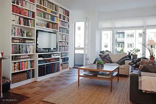 如果客厅空间允许,可以设计一体式开放式书柜。考虑到儿童和成人的身高问题,书柜应进行高低分层,这样放置儿童书籍和成人书籍也便于分别取放。