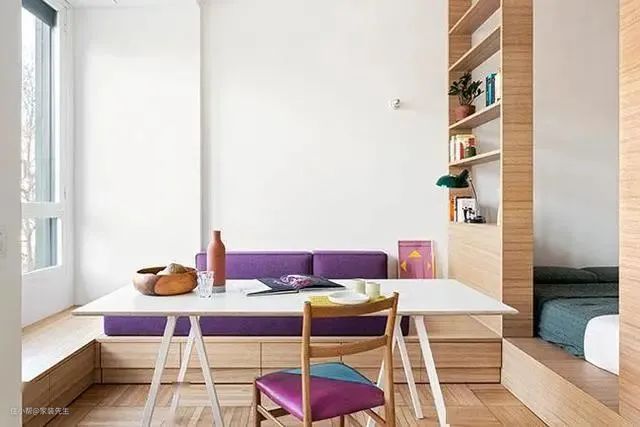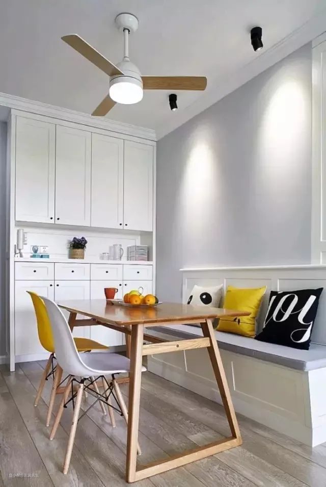 对于采光差、空间有限的公寓,可以尝试客餐厅一体设计。客餐厅一体化计的最大特点是打破两个区域的界限。客厅和餐厅之间没有视线障碍,整体空间变得更加开阔。许多客餐厅一体设计的家庭喜欢安装卡座作为沙发。卡座的明显优点是体积小,占地面积小。卡座也有一定的美观和储藏空间。
