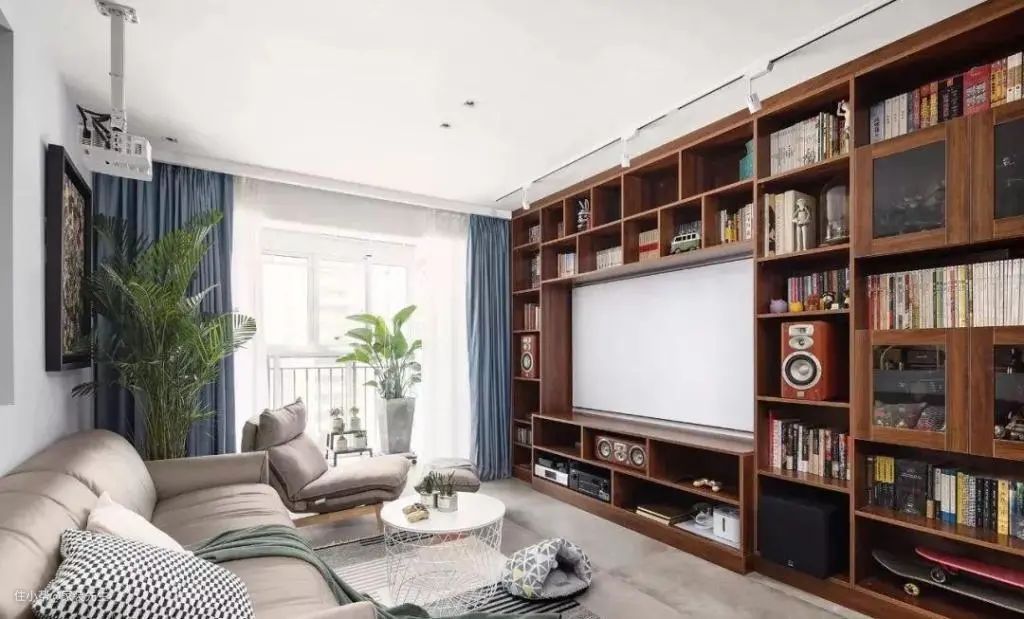 因为空间有限,喜欢追剧的家庭想看电视的时候可以直接投影。一字型布局、沙发、投影仪可以打造家庭影院,一家人坐在一起看电影追剧聊天也是一个美好的家庭时光。