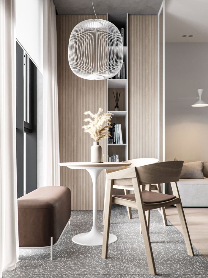 为了扩大空间,餐桌和椅子也可以作为客厅沙发和茶几的功能,这不仅减少了家具的数量,而且使空间更加灵活,方便了日常用餐、接待客人、学习办公与孩子互动。