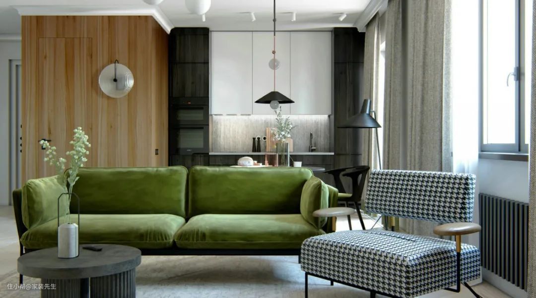 沙发靠半墙隔开,适合客餐一体化家庭。