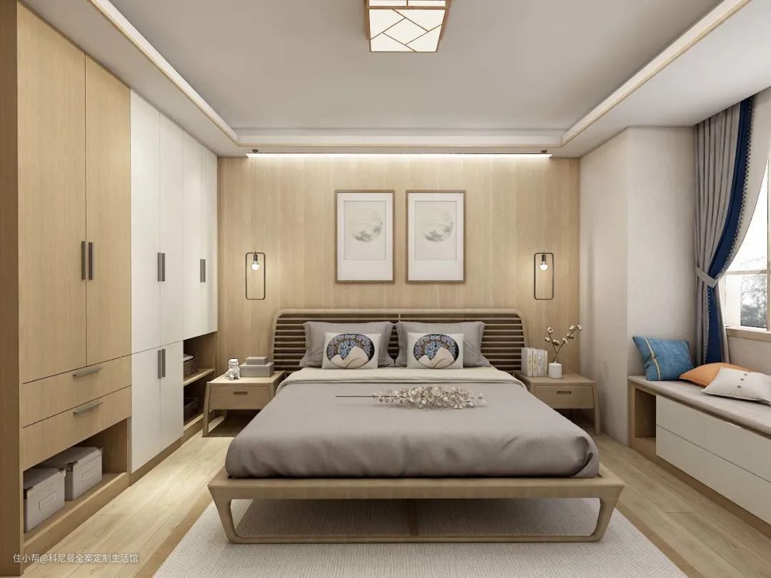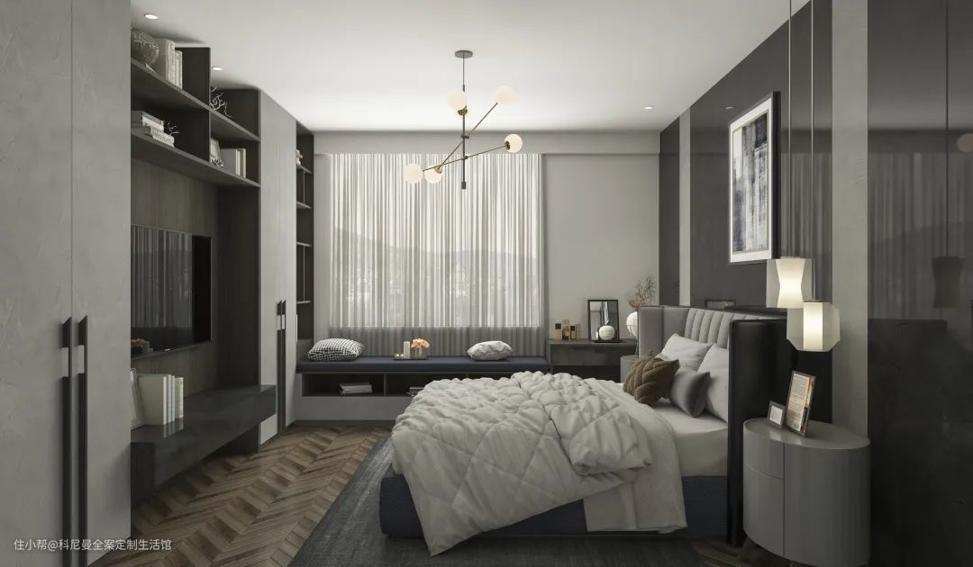 飘窗最厉害改造之法就是装完多出一间房!将飘窗改为榻榻米,把飘窗拓宽到适合睡眠的尺寸,若长度允许在床的头尾增加柜子,日常物品随取随放,化身为一间多功能房。