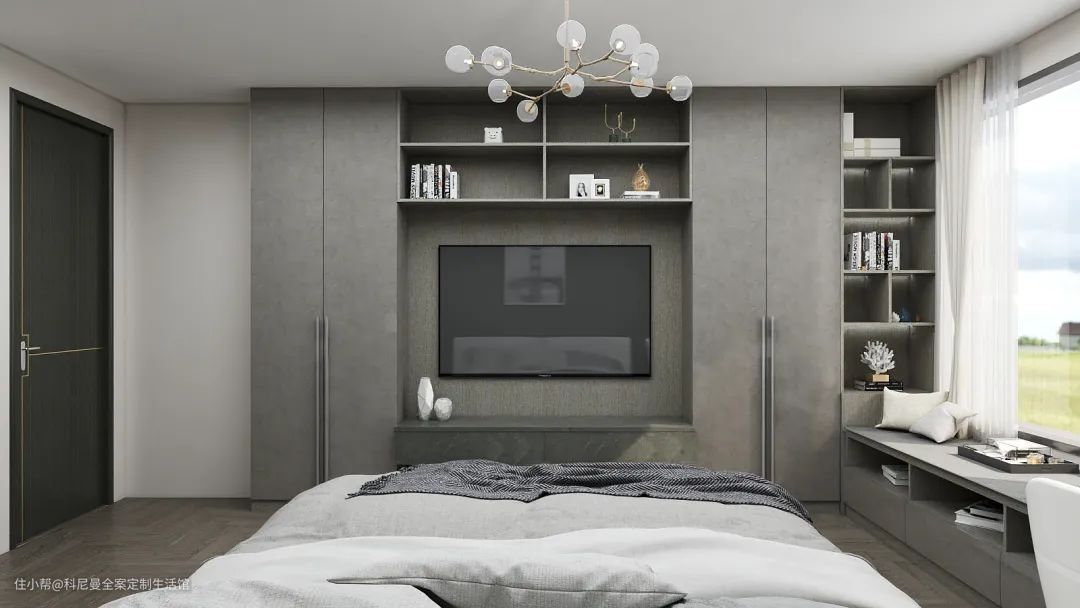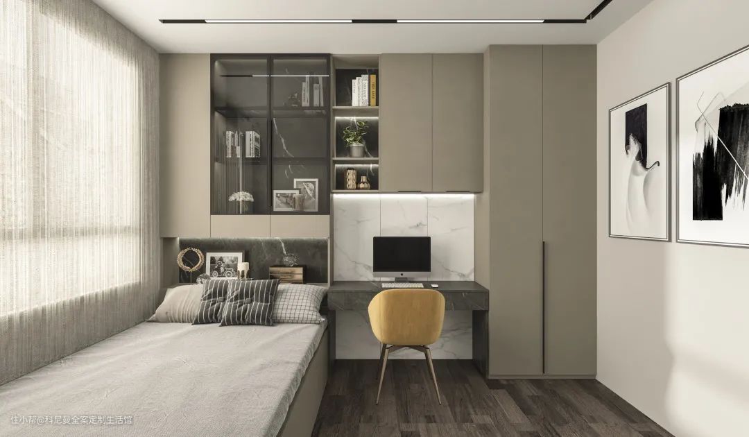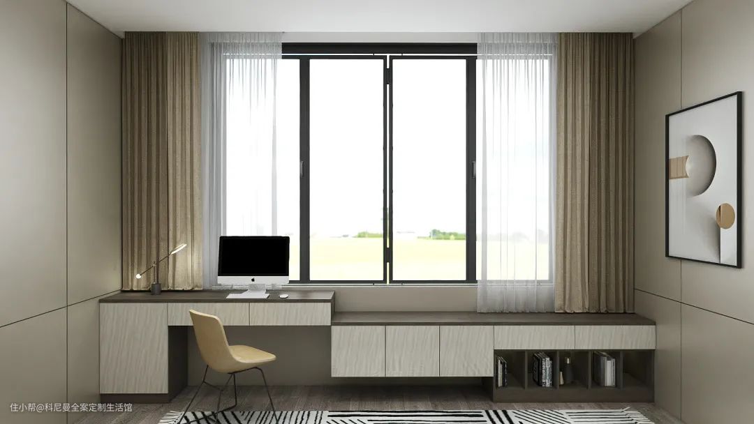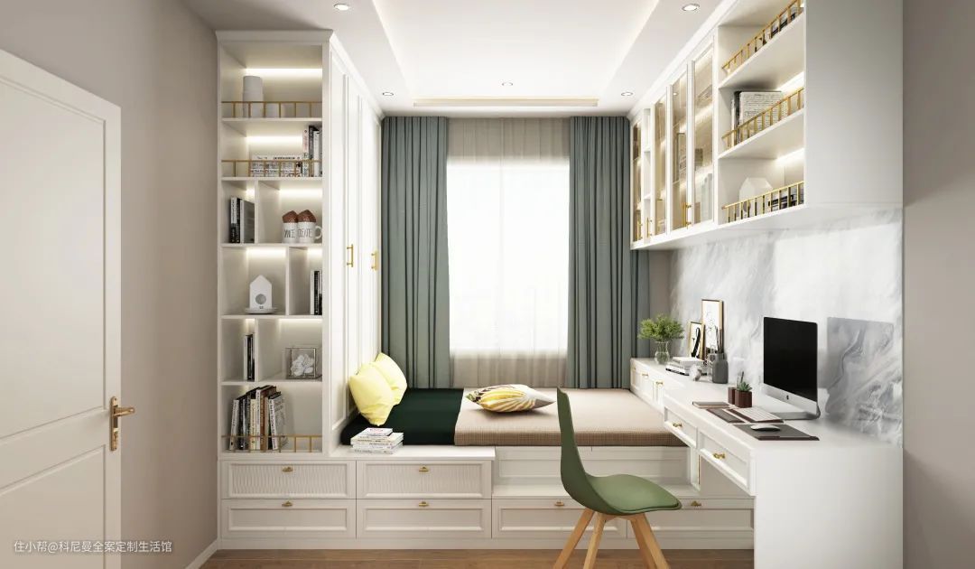 当房屋面积较小,无法实现独立书房的时候,飘窗的位置光线充足,改造成书房是兼顾美观和利用率的优秀选项。如果要满足女主人的化妆需求,把飘窗区改造成一个小型梳妆台,不仅将边角位直接升华,也扩容了屋内空间。