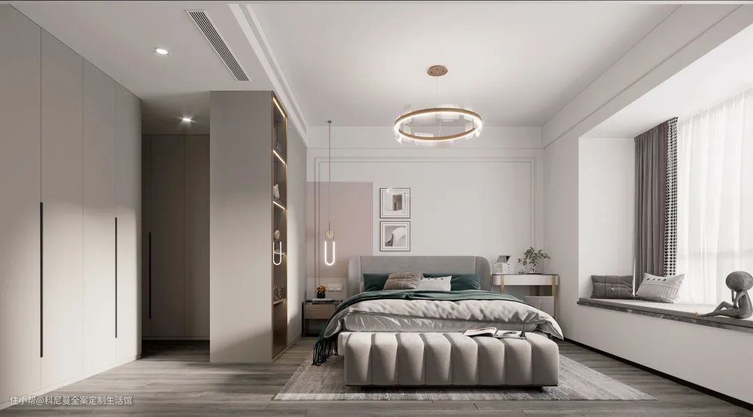如果要满足女主人的化妆需求,把飘窗区改造成一个小型梳妆台,不仅将边角位直接升华,也扩容了屋内空间。