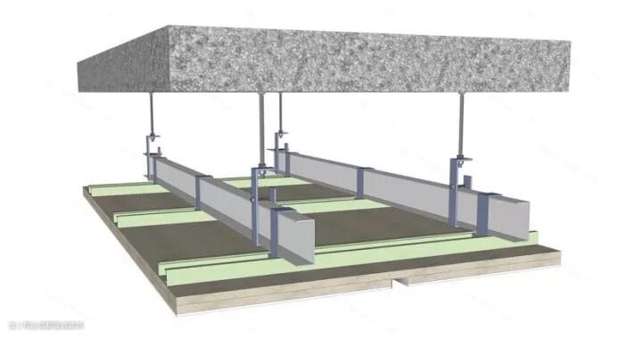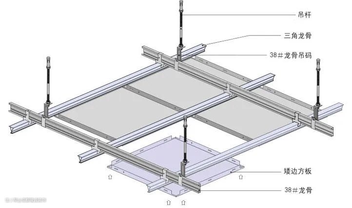 1、在吊杆位置钻孔,用膨胀螺栓将吊杆与结构相连接,用吊挂件将主龙骨与吊筋连接,之后一次完成边龙骨、次龙骨和横撑龙骨的安装与固定。