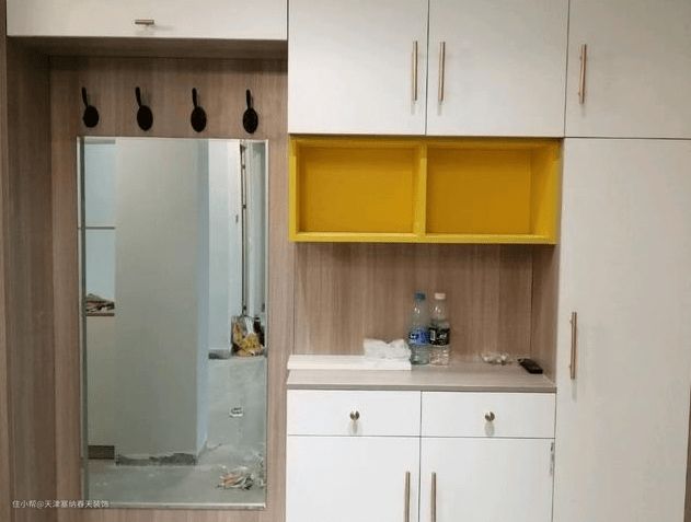 入户玄关,木工活儿还是真的可以,还特意装了穿衣镜,现在工程都差不多了,就还有一点踢脚线没装好。还是挺喜欢这个玄关柜的样式的,有鞋柜,抽屉,展柜,还有挂衣区,换鞋凳,超给力!