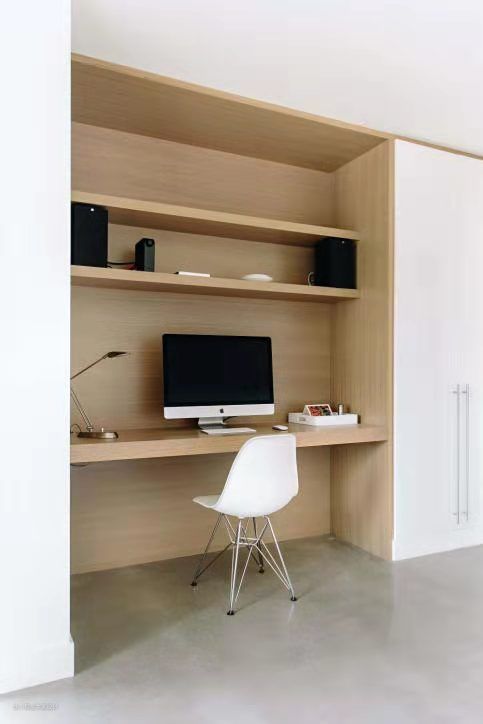 书桌设计在转角与储物柜之间,凹陷的设计给人有独立空间的安全感,悬空的长形置物架能根据使用者需求自由规划。