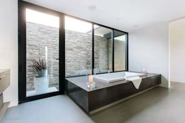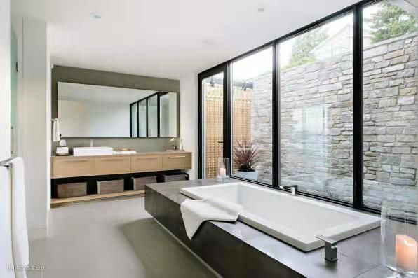 入户的浴缸设在落地玻璃窗边上,与户外景观直接相连,但是有外部墙体作为遮挡物,因此不用担心隐私的问题。