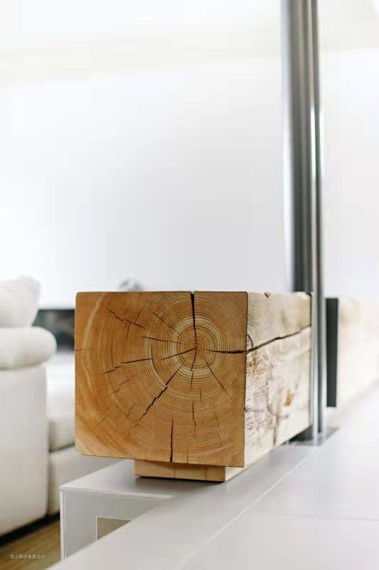 露出裂纹的方形木质低栏隔在走道与客厅中间,为客厅提供适当的隐私保障的同时也不会完全阻碍空间的视野,木材与金属的结合也有带一点工业风的感觉。