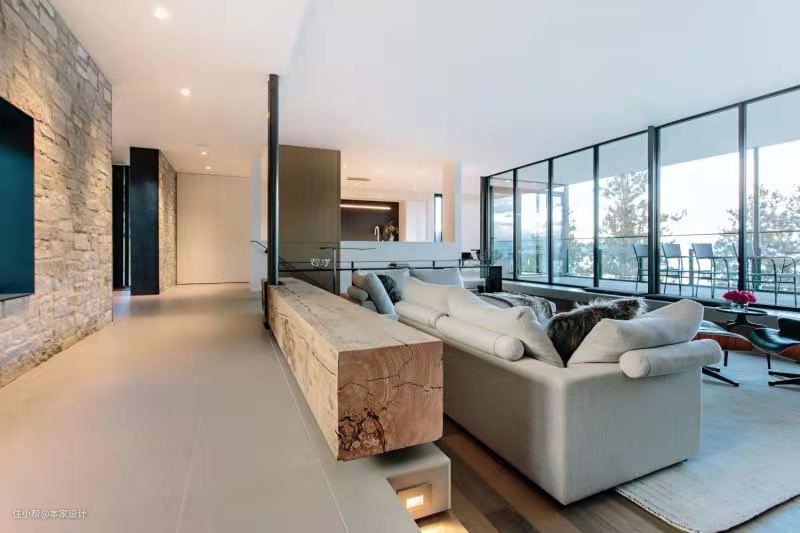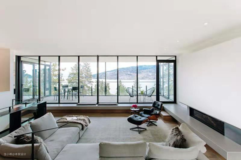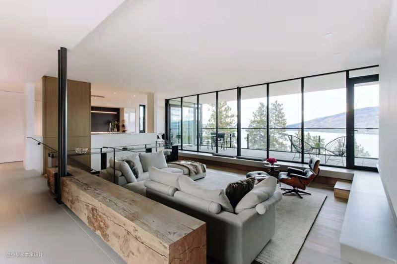 客厅一侧与外部露台相连,宽敞的大型落地玻璃窗把窗外的风景收入室内,也为无主灯的客厅引入自然光源。