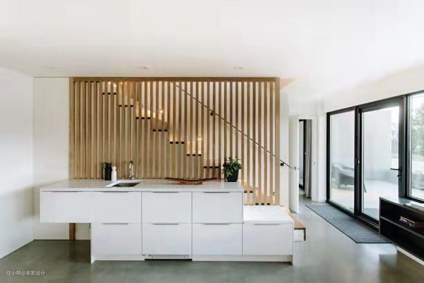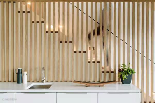 白色的方形储物柜以错开的Z形摆放在楼梯侧边,储物柜与楼梯中间设计了木质栅栏作为阻隔,让光线有虚实的变化,同时保留上下空间之间的遮蔽性。