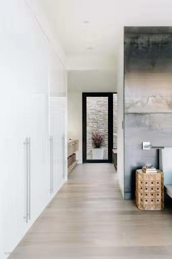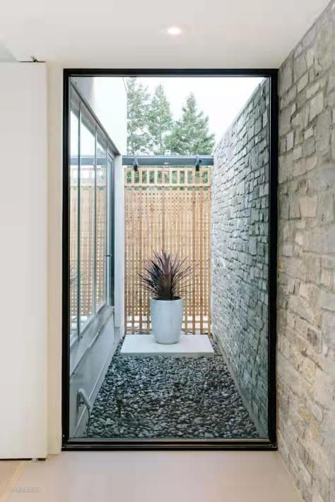 走道尽头的墙壁被落地玻璃窗替代,能直观的看到外部摆式,还能提高走道采光。