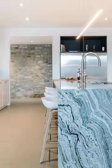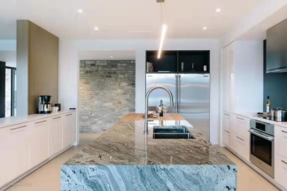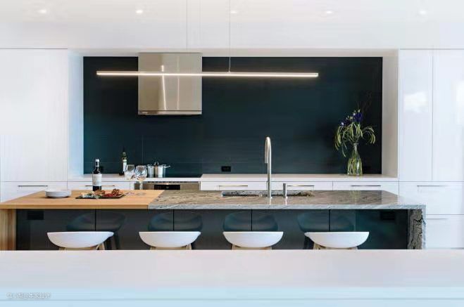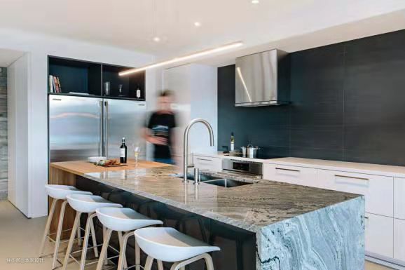 灰色大理石和原木拼接的中岛吧台与洗手池合二为一,吧台前安放了四张白色简约的高脚凳,让人在做料理的时候也能与一旁的家人朋友交流互动。
