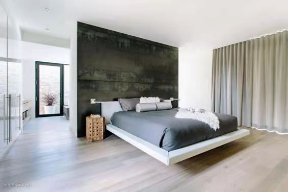 大床设立在主卧的中央,一面黑色木质饰面板装饰的墙体隔开了后面的浴室,保障空间的干湿分离,也让空间形成便利的环形动线。