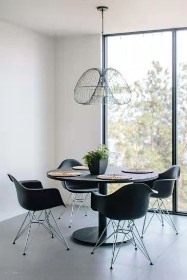 通透的网状金属吊灯吊让人不会因为高度而产生压迫感,黑色的圆形四人餐桌安排在落地窗边,方便户主在进餐的同时欣赏到户外风景。
