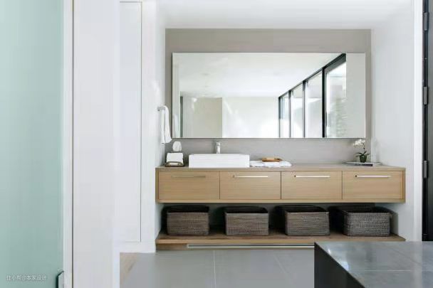 长形的洗手池有足够的空间让两人同时使用,悬空的浅木色抽屉和底部的篮子提供了充分的蓄物和收纳空间。