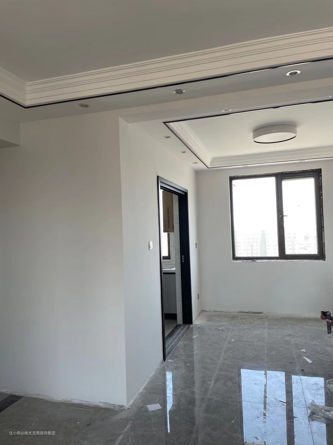 全房是灰色乳胶漆调色,餐厅顶面用了简单的金属线条装饰。