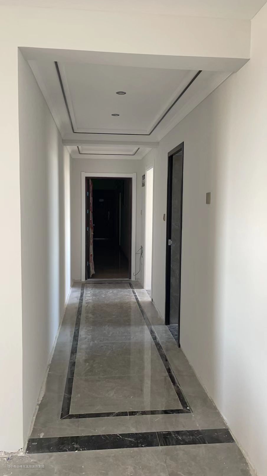 过道用了简单的波打线,做了造型。灰色大地砖,用黑色波打线。