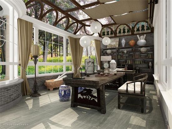 新中式书房家具依然讲究对称性的摆放,对称的椅子或是书柜,同时书房中的装饰物业具有一定的对称性。同时书房家具的摆放应该主次分明,一般将桌摆放在书房中较为显眼的位置,同时依次摆放书柜、椅子以及其他的书房中的装饰物品5
