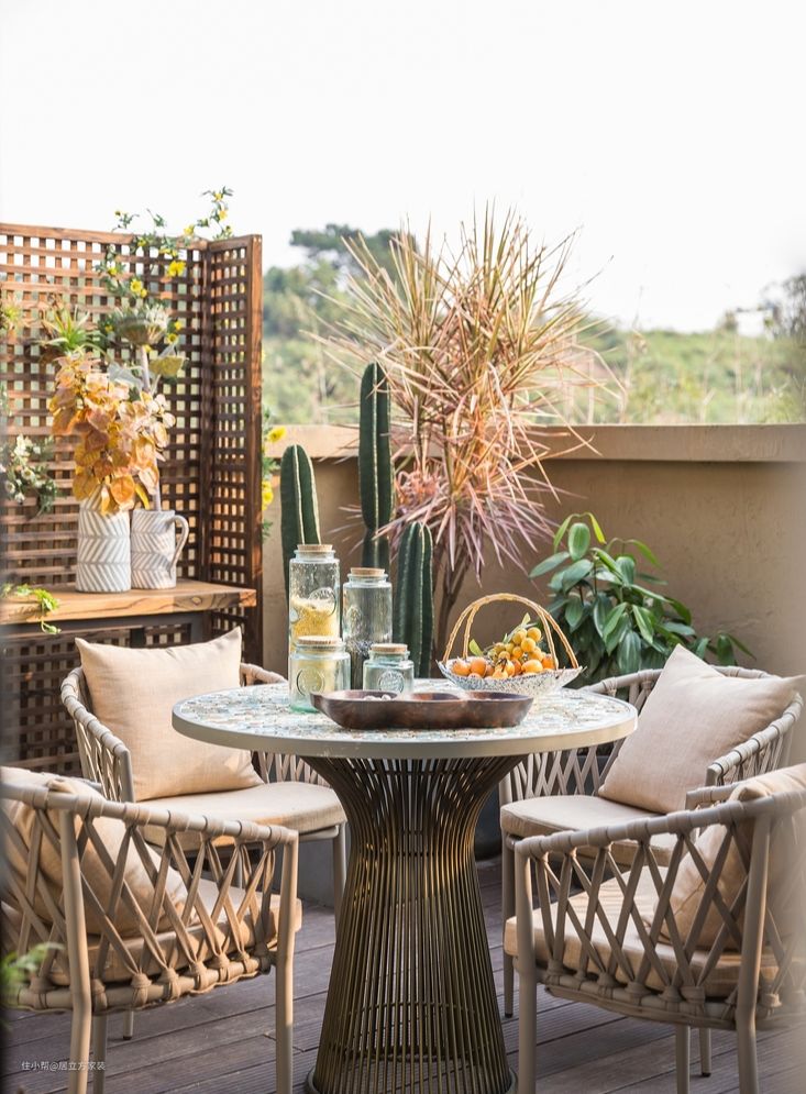如果还想要再简单点,那咱们可以选择躺椅,没事晚上出来吹吹风也很舒适,躺椅比较轻搬来搬去的也比较方便。躺椅+边几+遮阳伞的组合,可以想象一下自己在海边度假...除了没有海,其它都挺好,只要心里有海,躺哪里都是夏威夷。对于面积不是很大的露台来说,可以摆上休闲桌椅,喝喝下午茶,和闺蜜聊聊天吃吃甜品,感受一下贵妇的快乐~