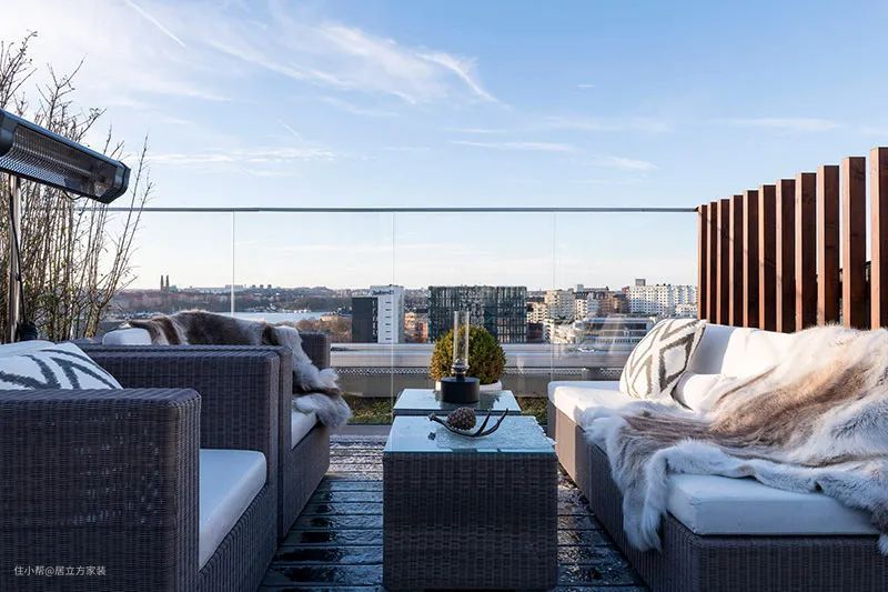 当然,并不是每个小伙伴们都是爱好种菜种花,那么休闲设计也很好,就把露台打造成休闲露台。最简单的入门方式就是放上户外沙发或躺椅,一个小户外休闲区就完成了,根据空间大小来看小露台可以放单人沙发+边几,大露台可以放组合沙发,但是不管买什么记得选择户外款哦~毕竟室内的沙发可受不住风吹日晒雨淋。