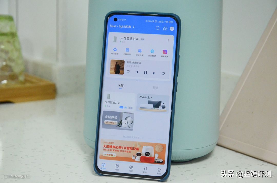 从产品的名称上相信大家也应该可以看出来了,天猫精灵火鸡智能刀架是火鸡跟天猫精灵的合作产品,内置了天猫精灵,简单点来说,就是刀架内“塞入”了一个天猫精灵智能音箱,属于天猫精灵智能生活硬件中的一员。