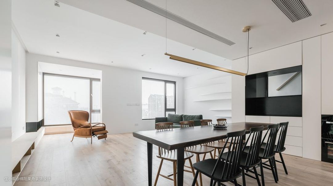 首层共享客厅是他们的汇聚点。 开阔的大厅一侧为孩子游戏手工区域,另一侧为一家休息、观影区域。