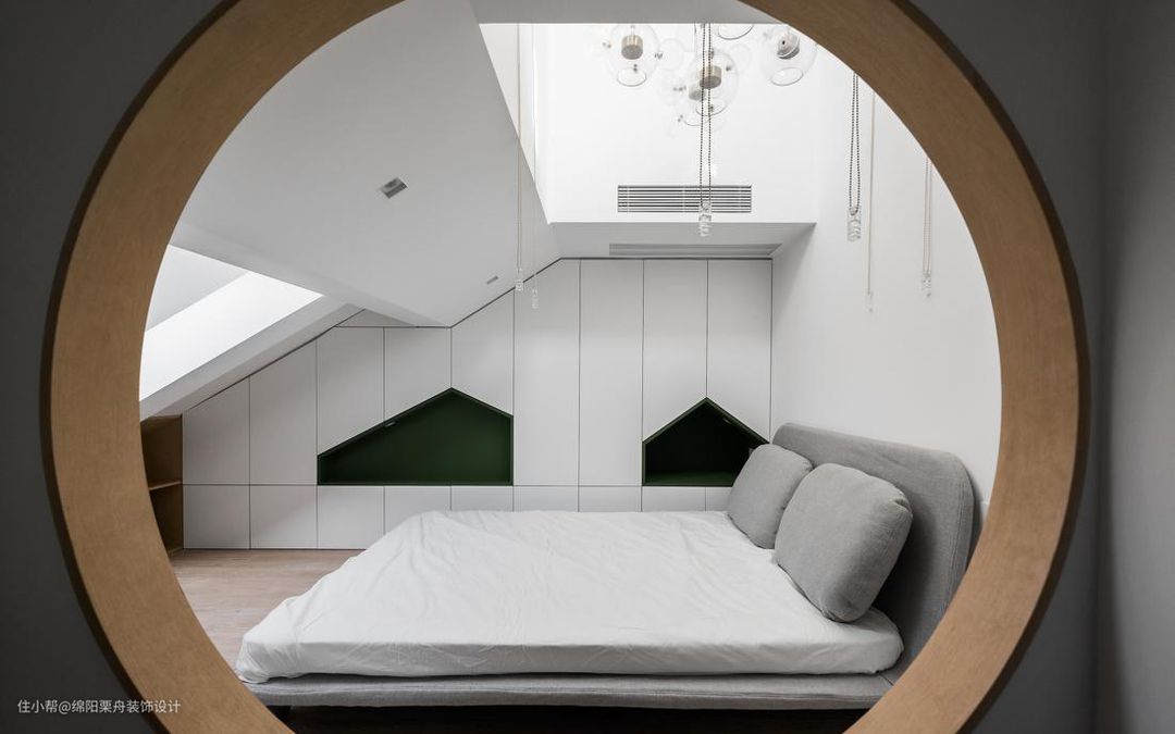 我们充分利用既有的坡屋顶结构,转化为三个阁楼的空间。 保留原阁楼中部及北部区域,形成独立的顶层阁楼,而原阁楼南侧低矮处则分别切分给下层的儿童房及主卧。