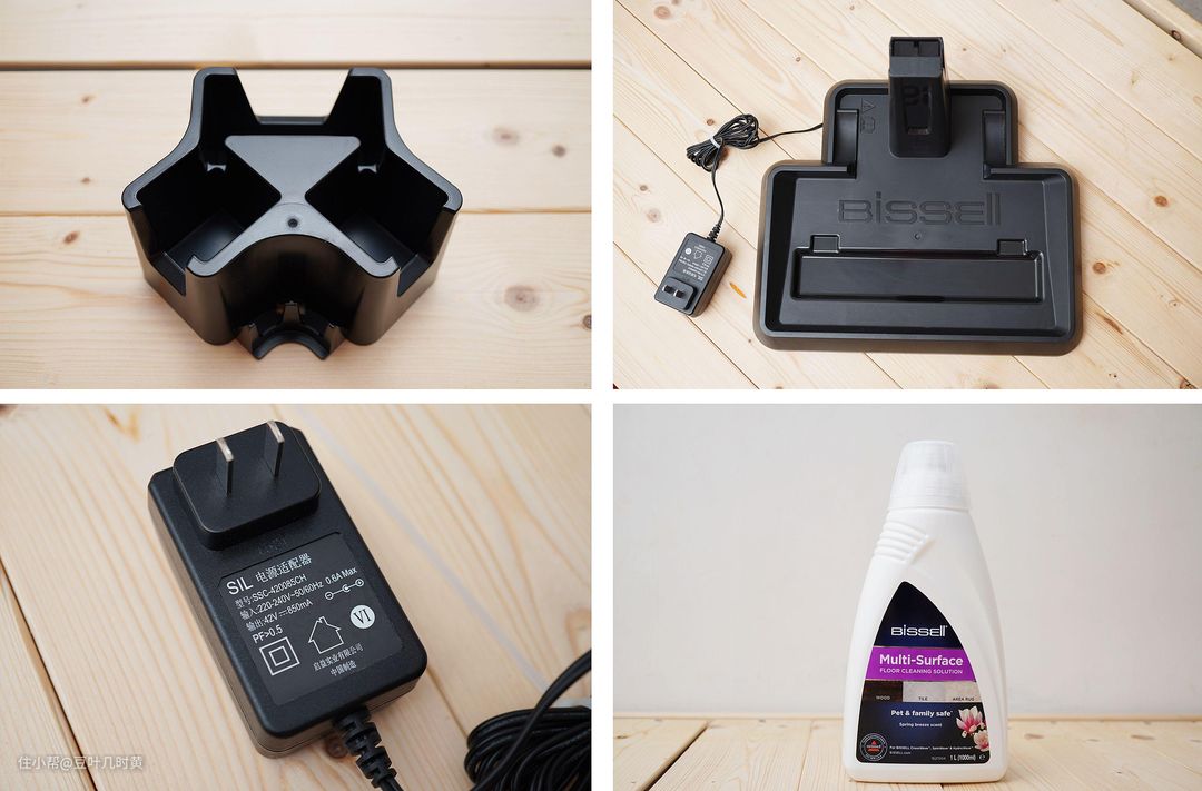 ▲全家福。洗地机主机采用了分体包装,其实也就分离了手柄和主机身,所以组装也会比较简单。除了主机,还有一大瓶原装清洁液、说明文件、滚刷架、充电器和充电底座。