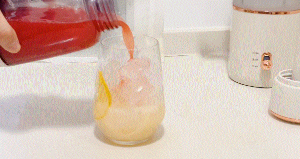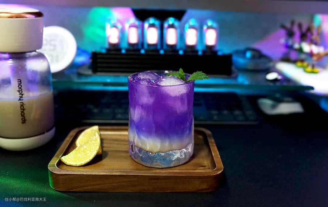 第三步:杯中加入冰块,倒入刚打好的荔枝气泡饮,然后加入蝶豆花水调色。挤入几滴柠檬汁,瞬间就有蓝紫色的渐变层了,非常漂亮,同时也能增加气泡水的口感。
