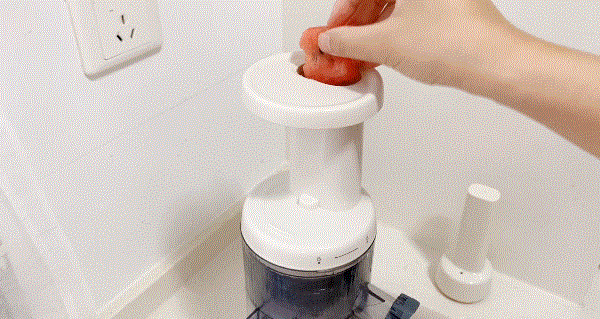 第一步:我们先来榨西瓜汁,操作很简单,把西瓜切块,不用太细致。然后放入进料管,启动开关就开始研磨了,过程中可用推料棒加速果汁研磨的速度。
