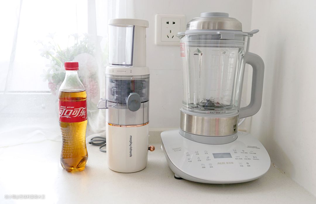 图中可以看到,摩飞这款的体积只比500ml饮料高一点,占地面积大概是之前那台破壁机的四分之一大小。再加上机器是一边出汁、一边出渣的设计,大大缩小了整体体积,算非常轻便小巧的了,对小户型很友好。