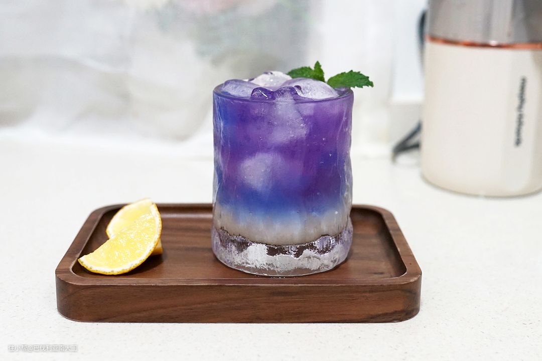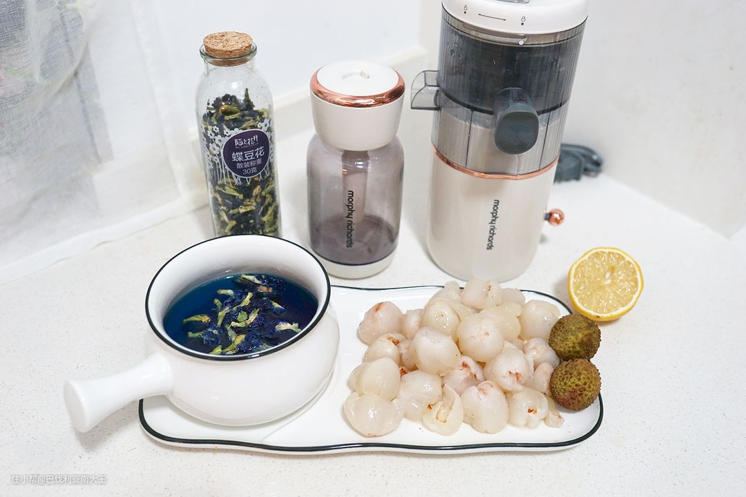 所需食材:荔枝、柠檬、薄荷、蝶豆花花水、冰块