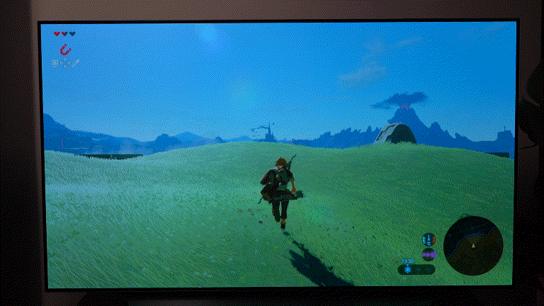 虽然NS的游戏画面质量普普通通,配合LG OLED 65C1使用有点杀鸡用牛刀的感觉,但是二狗家里除了PS4也就这台游戏主机了,演示下热门的塞尔达也是不错的。人物和场景细节也表现清晰细腻,特别是背景纹理细节可以看得十分清楚,大光比下普通电视难以看清的明显细节,电视画面也得到了极好的呈现。整个画面在色彩、对比度和层次过度方面,相比二狗平时使用的电视来说着实优秀不少。