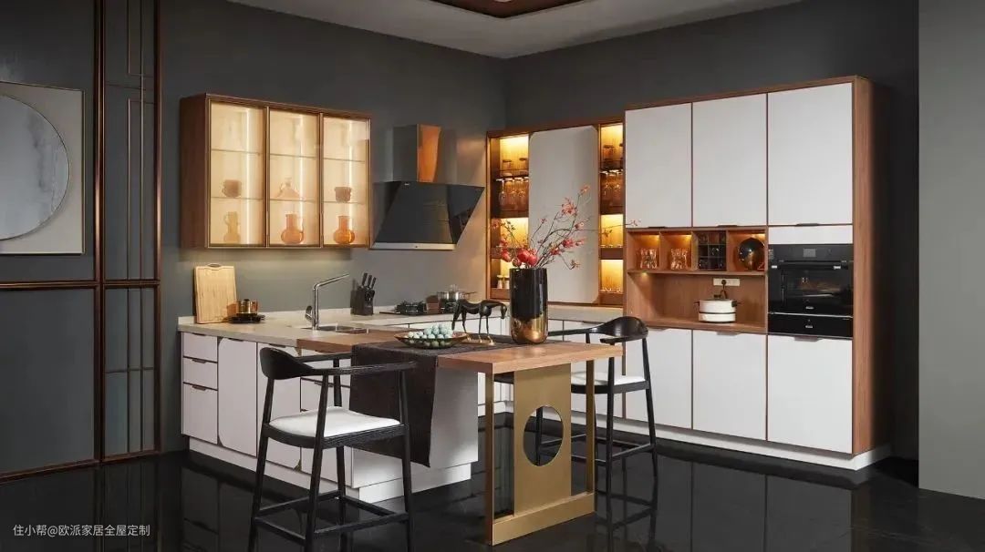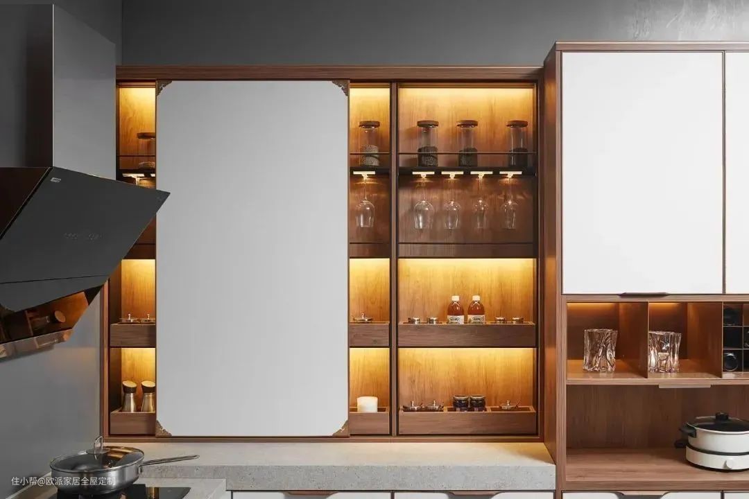▲封闭吊柜与开放式隔板设计一藏一露,提升空间层次美感。玻璃柜与金属开放架,收纳与展示功能兼具。