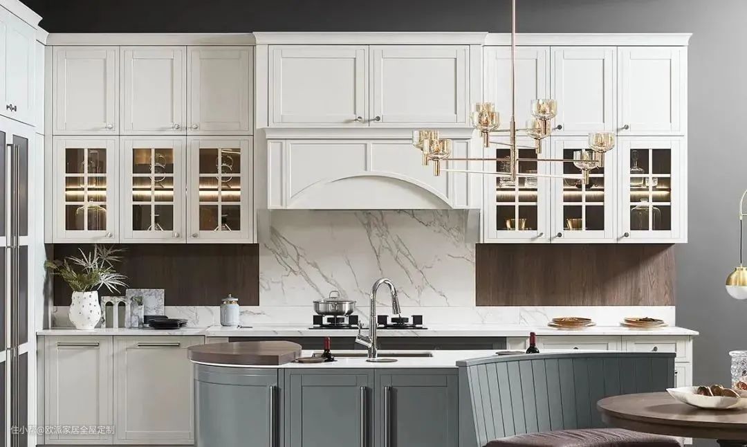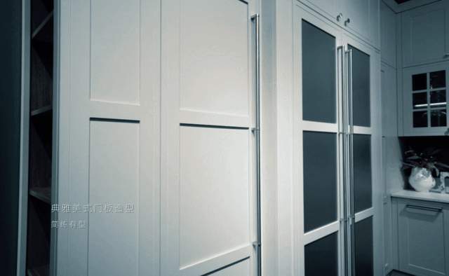▲古典美式门板造型,搭配现代材料银色金属拉丝芯板,形成外观风格一体化设计,整体橱柜高端大气,视觉统一,充分展现古典韵味美。