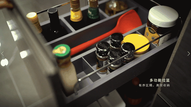 ▲拉篮与门板联动设计,轻轻一拉整柜滑出,充分利用了纵深空间;门后小篮筐,柜内大篮筐组合使用,既节约空间,又能保证厨房用品合理收纳。