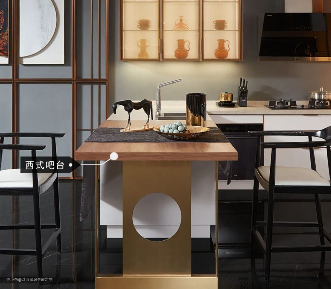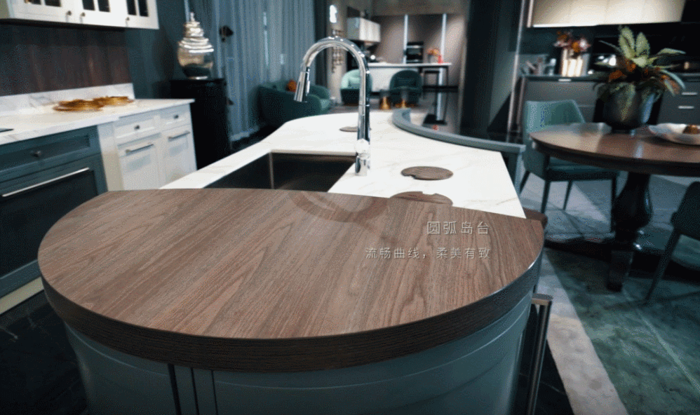 ▲圆弧台面及门板打造弧形岛台,造型凹凸有致,它将吧台、冰桶、餐椅集于一身,适用于多功能场景,塑造出优雅的生活方式。