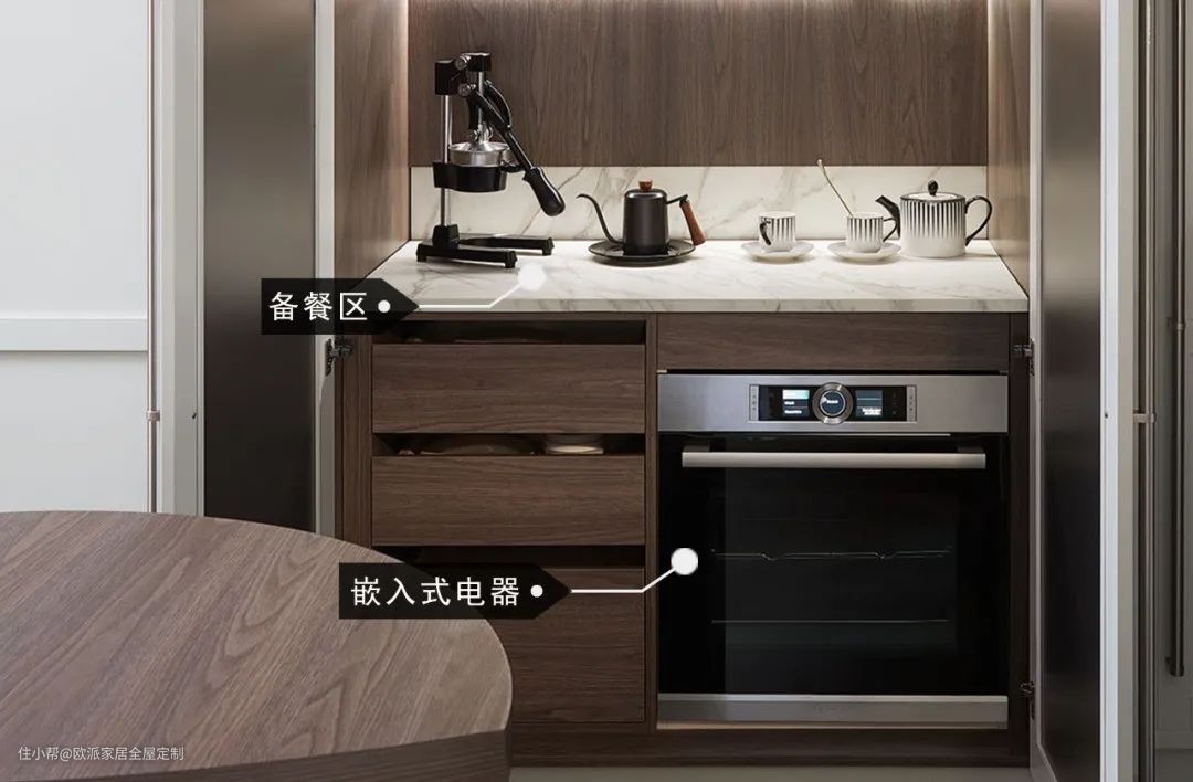 ▲中间台面用于简单早点的备餐之地,底部则设计了嵌入式电器,空间利用率高,美观性和整体性也都增强了。