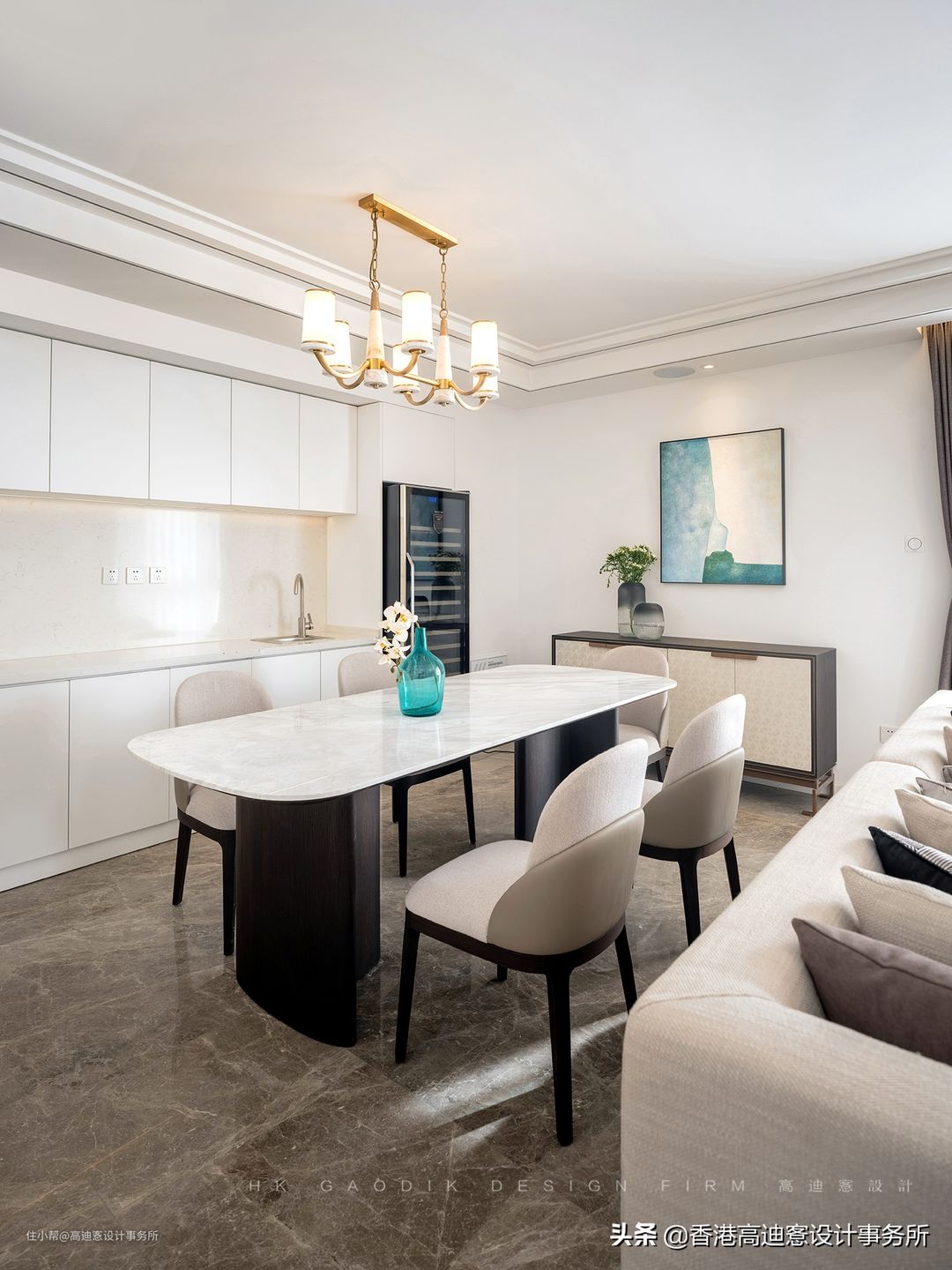 想要尽可能少的装饰物、尽量简洁的空间,喜欢现代简约或极简风格的家人在考虑餐边柜的时候就要保证既能实现餐边柜的需求又能不破坏风格不增加装饰物,那么将餐边柜与餐桌相连,延长桌面或做成岛台形式增加一侧的储物便是很好的选择。#寻找头条生活家#
