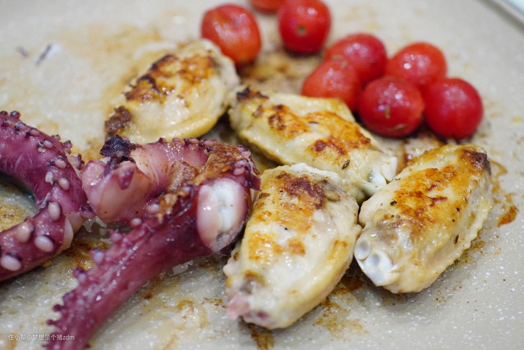 相对来说,摩飞的这个多功能料理锅在尺寸上小了不少,处理多人食材时不是特别方便,像我用煎烤盘煎一些虾仁、八爪鱼和鸡翅时,食材的分量并不多,但是已经堆得满满当当。