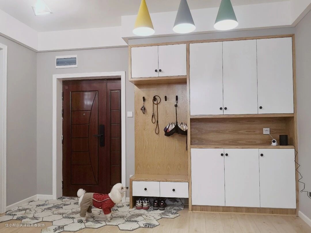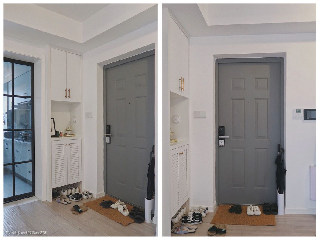 有些户型,入口门直接面对客厅的沙发,门两边没有放置鞋柜的地方,可以设计一个L型的鞋柜,门的位置稍微朝向内部,其实相当于一个隔断,同时这种设计形成了玄关。设计“L”形的主要目的是为了表现空间看起来比较宽敞,不至于遮挡整个区域,在留白空间中起到一定的作用,而且相当不错。而且原来没有玄关,所以设计了鞋柜,可以方便存放家人经常穿的鞋子。